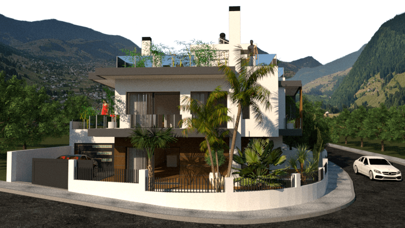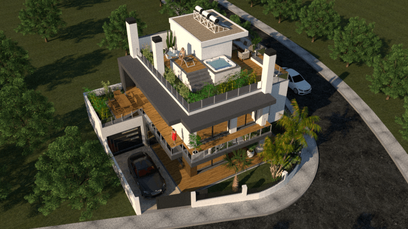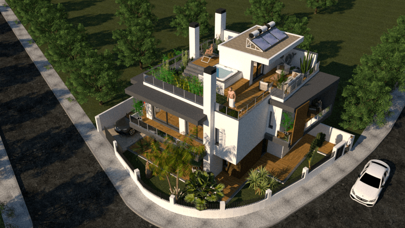 • No piso térreo tem um hall de entrada, escritório/quarto, WC social, uma espaçosa sala de estar e jantar em open space com uma cozinha de luxo totalmente equipada com acesso ao jardim e churrasqueira coberta. Tem ainda um anexo coberto que pode servir para box para dois veículos.